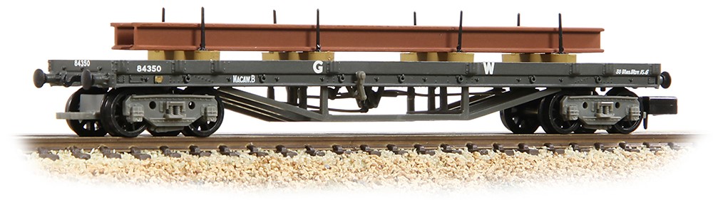 Our final Bogie Bolster Wagons are ‘Macaw B’ wagons in GWR Grey. 373-927C has the number 84350 and 373-927D has 84249. As with the other wagons, this pair of models both feature NEM coupling sockets, an accessory pack and a wagon load of steel girders.