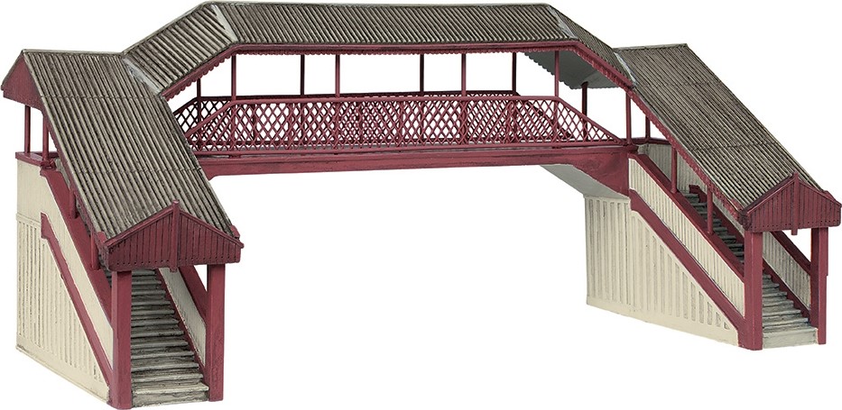 Our first group of models is this pair of Covered Metal Station Footbridges. Both bridges have stairs with wooden cladding painted in cream and a corrugated metal roof to provide passengers with some protection from the weather while crossing above the tracks. 44-020B has the metalwork and other highlights painted in blue, while 44-020R has the metalwork and other highlights painted in red.