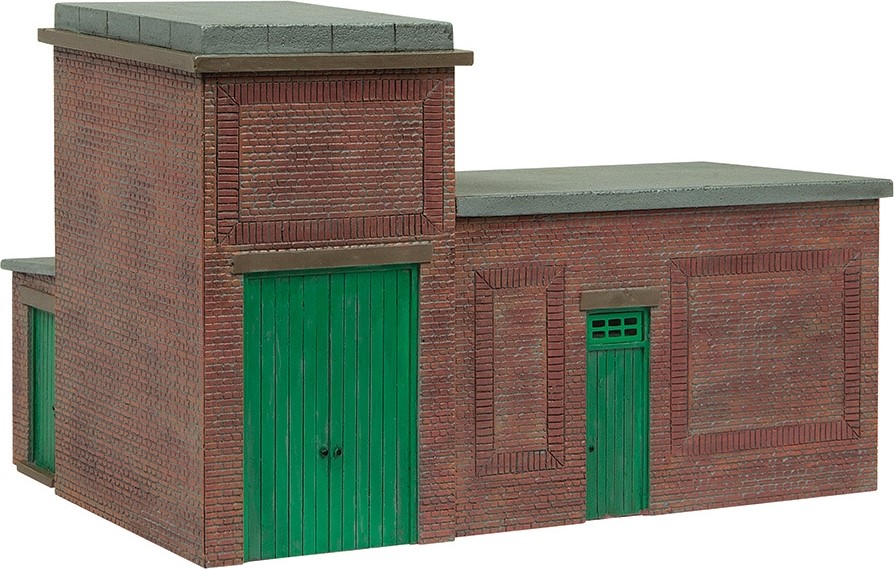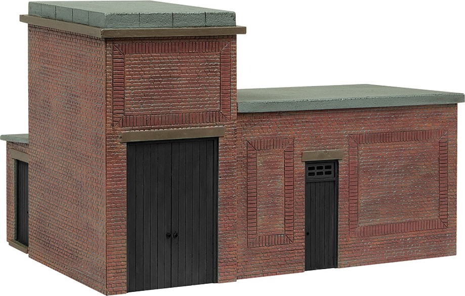 Moving along the line now, we have this pair of Lineside Brick Substation building models. In areas with electrified lines, these buildings would contain the equipment and machinery needed to provide power to the railway at the correct voltage. 44-0181G is decorated with green doors and highlights, whilst 44-0181B has those same details painted in black.