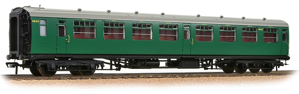 Our next model, 34-775, depicts a SR Bulleid Third Corridor Coach during the early years of the transition to British Railways. The coach is still decorated in the Southern Railway’s Malachite Green livery, but has many details that were applied by BR, including the number of S1935. The model has smooth bodysides, a single vacuum brake cylinder, Mk1 battery boxes, a Mk1 dynamo, short footboards, and a short roof tank. This coach did not belong to any fixed set and would have been added to pre-existing sets when additional capacity was required.