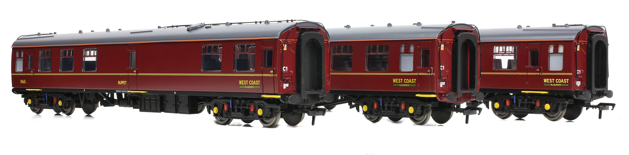 The coaches are carried on Commonwealth Bogies with yellow axle boxes and red springs. Metal wheelsets with a blackened finish are fitted to all coaches and the standard ‘tension lock’ couplings are mounted on close coupling mechanisms – these allow the models to couple closely together whilst still enabling them to be used on curves as small as second radius.