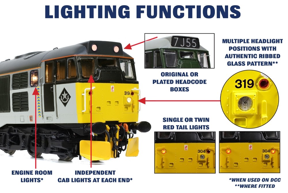 - Directional lighting, including illuminated headcode panels and high intensity headlights where applicable, switchable on/off at either end on DCC or Analogue control