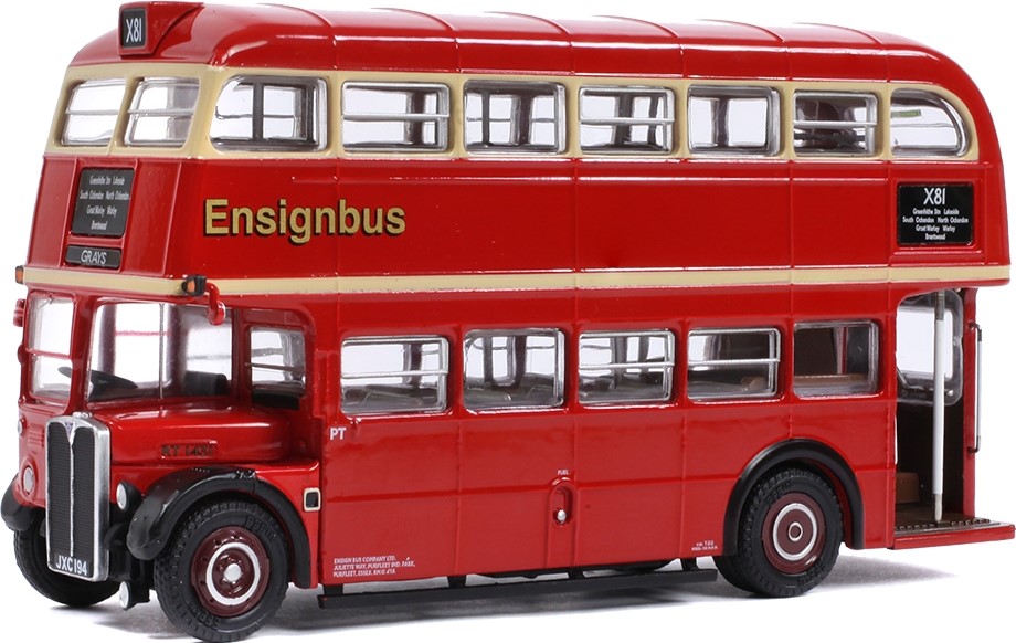 The first bus in this set is RT1431, which has a registration number of JXC194 and is decorated in red and cream livery with cream upper deck window surrounds. This bus is assigned to route X81, with destinations for Greenhithe Station, Lakeside, South Ockendon, North Ockendon, Great Warley, Warley, Brentwood and Greys. The bus does not feature adverts on the sides or back, but carries the Ensignbus branding on the side in gold.