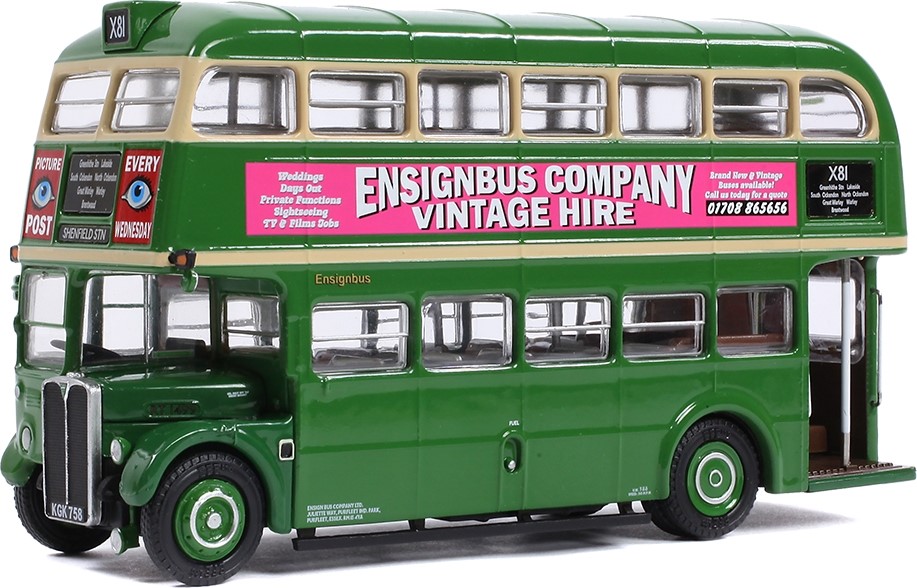 The second bus in the set is RT1499, which has a registration number of KGK758 and is decorated in green and cream. This bus is also assigned to route X81 with destinations for with destinations for Greenhithe Station, Lakeside, South Ockendon, North Ockendon, Great Warley, Warley, Brentwood and Shenfield Station. This bus features adverts for the Ensignbus Company on the sides and Aspro on the back.