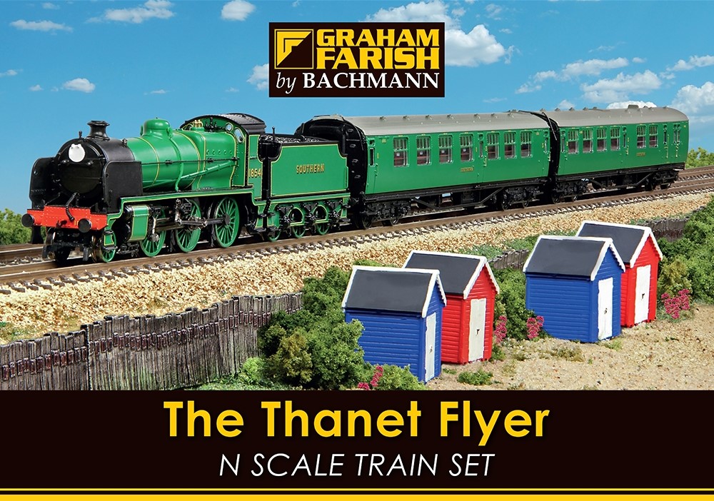 The penultimate set is 370-165, which is The Thanet Flyer Train Set. This set contains Era 3 SE&CR N Class Locomotive No. 1854 in SR Malachite Green, along with a pair of Bulleid Coaches decorated in the same colours. The locomotive features the following: