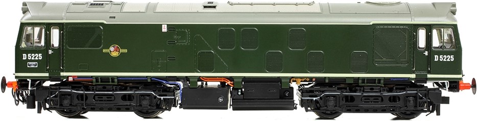 The seventh model depicts Class 25/1 No. D5225 in BR Green with Small Yellow Panels and headcodes 3C90 and 2H53. This locomotive features the early style of body with the original gangway doors, engine exhaust and water filler door. Below the solebar, there is a 580 gallon water tank alongside the 510 gallon fuel tank, original battery boxes and late pattern sand boxes.