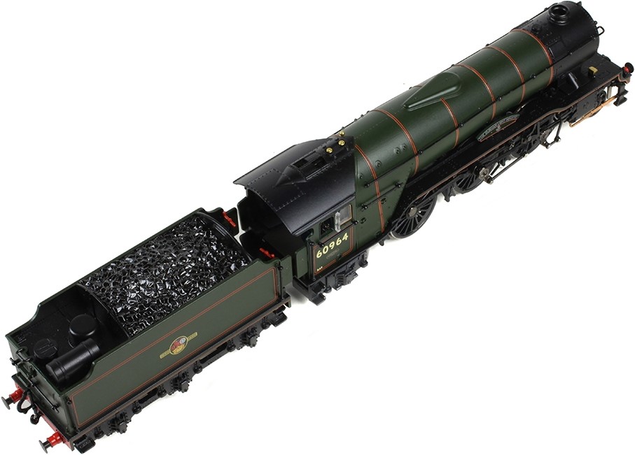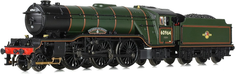 The penultimate LNER V2 class locomotive is No. 60964, which has been named ‘Durham Light Infantry’ and is decorated in BR Lined Green with the late BR crest. This locomotive still has the original ‘Monobloc’ cylinder casing but features the BR smokebox door with the number plate and higher top lamp bracket and pre-fitted name plates. The tender now has a high-front/high-rear coal space divider