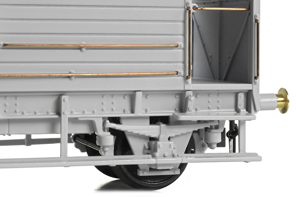 Alongside these individual features, every model boasts a sublime level of detail employing a high fidelity, injection moulded bodyshell which sports finely-moulded rain strips on the roof, precisely engraved panel lines, and thorough rivet detailing in all areas extending as far as the rears of the end panels and undersides of the ballast weights. Separate metal handrails are fitted throughout, including the balcony safety bars which can be fitted in the latched ‘closed’ position or left hanging ‘open’. Beneath the solebar, the W irons, axleboxes and springs are crisply moulded, supplemented by separate brake blocks and brake rigging. The exterior look is completed with the addition of separate footsteps and footboards, whilst metal buffers are employed along with blackened metal wheelsets and the standard tension lock couplings are carried in NEM coupling pockets.