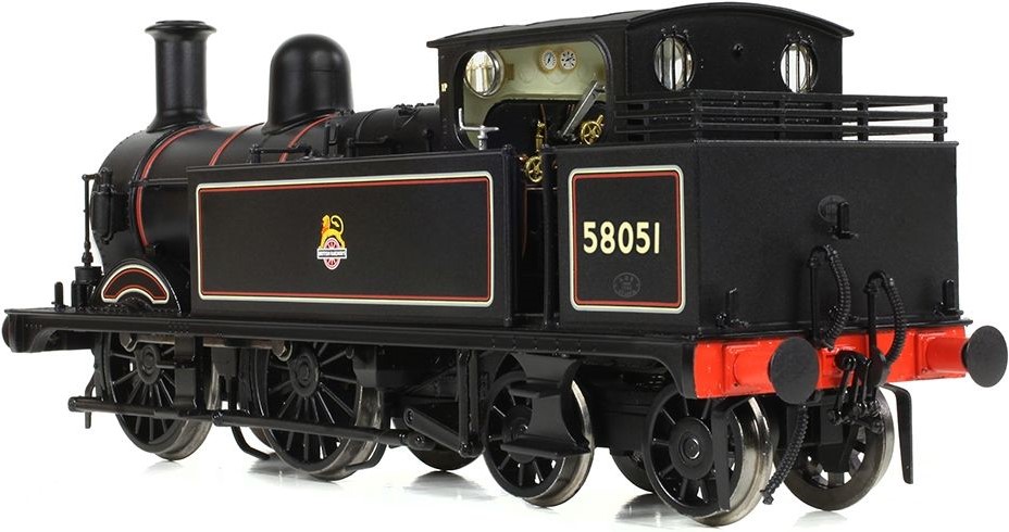 Our next pair of 1532 Class locomotives are Nos. 58051 and 58056, decorated in BR’s Lined Black livery with the early British Railways emblem. As with the previous pair, these have Belpaire boilers, standard side tanks, and 3 foot chimneys, but they have smokeboxes with BR style numberplates and bunkers with coal rails made of 3 bars. Also unlike the previous locomotives, this duo have been fitted with push-pull equipment.